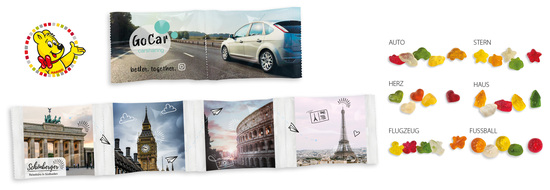 In einer Kette aus zwei oder vier Fruchtgummitütchen kommen die Standardformen von HARIBO besonders gut zur Geltung. Dabei können auch die Formate, Grammaturen und Kettenlängen angepasst werden. Zutaten: Glukosesirup; Zucker; Gelatine; Dextrose; Fruchtsaft aus Fruchtsaftkonzentrat: Apfel, Himbeere, Erdbeere, Orange, Zitrone, Ananas; Säuerungsmittel: Citronensäure; Frucht- und Pflanzenkonzentrate: Saflor, Spirulina, Apfel, Holunderbeere, Orange, Schwarze Johannisbeere, Kiwi, Zitrone, Aronia, Mango, Traube, Passionsfrucht; Sonnenblumenöl; Aroma; Holunderbeerextrakt; Überzugsmittel: Bienenwachs weiß und gelb., Kann Spuren von MILCH, WEIZEN enthalten., Nährwerte pro 100 g: Energie: 1459 kJ/343 kcal; Fett: 0,5 g, davon gesättigte Fettsäuren: 0,1 g; Kohlenhydrate: 77 g, davon Zucker: 46 g; Eiweiß: 6,9 g; Salz: 0,07 g, 10 - 12 Monate bei sachgerechter Lagerung