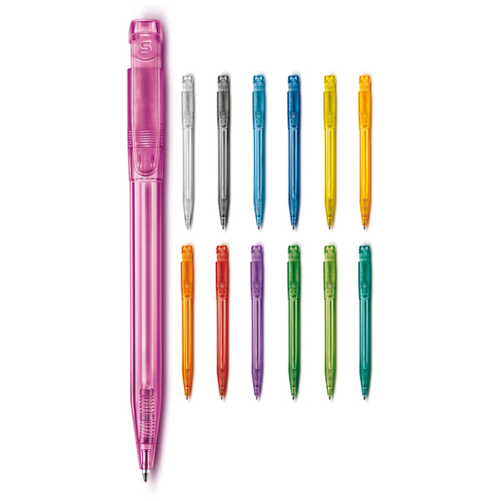 Schlanker transparenter Kugelschreiber in ansprechenden Farben. Ein schöner Werbeartikel wegen seiner Druckfläche. Mit synthetischer blau schreibender X20-Refill-Mine. Druckkugelschreiber aus ABS, hergestellt in Europa. Ab einer Abnahmemenge von 5.000 Stück sind eigene Farbkombinationen möglich.