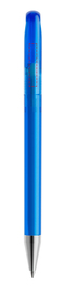 Mit seinem schlanken Gehäuse und der formschönen Kappe, die schwungvoll in den eleganten Clip übergeht, ist er ein Klassiker des Schreibgeräte-Designs. Wo die Kappe in den Clip des DS1 übergeht, lässt sich ein farbiger Punkt setzen. Oder man lässt die Form ohne Punkt einfach ihren Schwung ausleben. Ganz ohne Punkt und Komma. In der Ausführung mit gefrostetem Gehäuse und satinierter Metallspitze (TFS) lieferbar in sechs Standardfarben, hergestellt mit einem Rezyklatanteil von 50%, gekennzeichnet mit dem internationalen Recycling-Symbol. Sondergehäusefarben ab 10.000 Stück. Fünf Druckflächen für Werbeanbringungen stehen zur Verfügung. Der optionale Kappenpunkt ist auf beiden Seiten in fünf Farben bedruckbar. Ausgestattet mit der umweltfreundlichen auswechselbaren FLOATING BALL® lead free-Großraummine 1.0, Schreiblänge 5.000 m, Schreibfarbe Blau oder Schwarz.